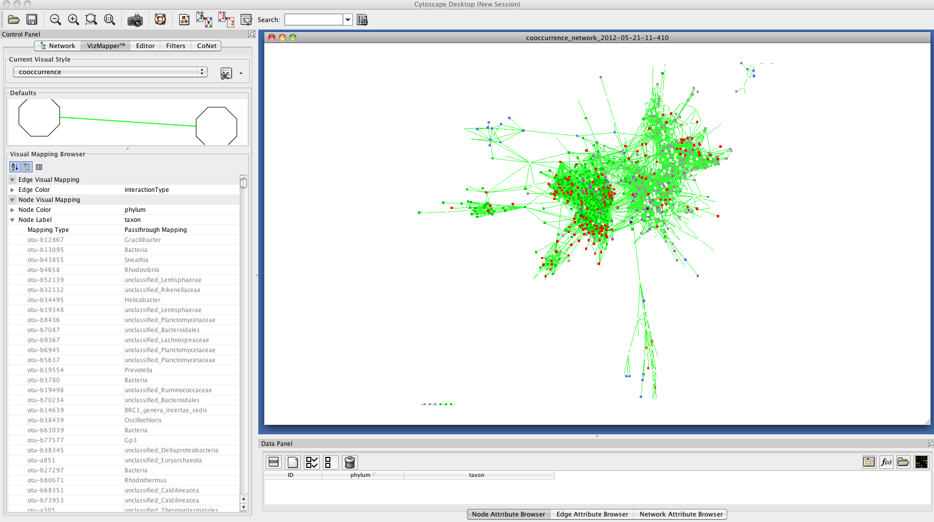 You can then use the VizMapperTM to set phylum-specific node colors or load this tutorial's vizmap property file to set pre-assigned phylum colors. After these processing steps, the network
