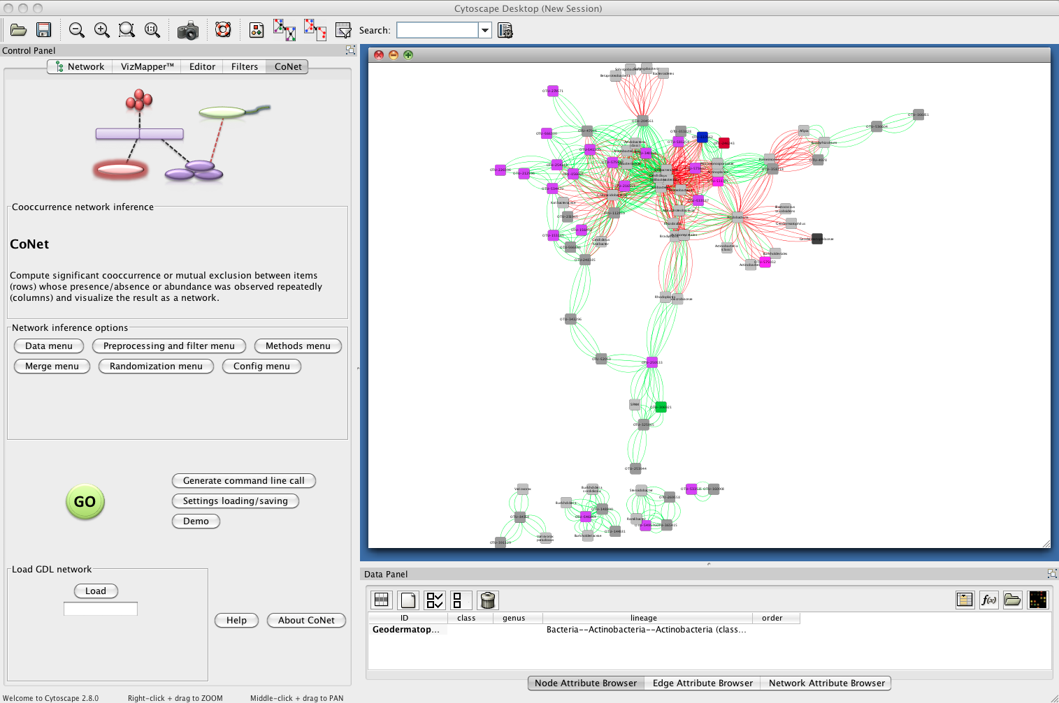You can then use the VizMapperTM to set phylum-specific node colors. After these processing steps, the network