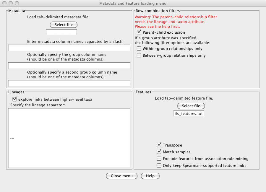 in the "Metadata and Features" sub-menu). Please also enable "Biom file in HDF5 format" in the Data menu.