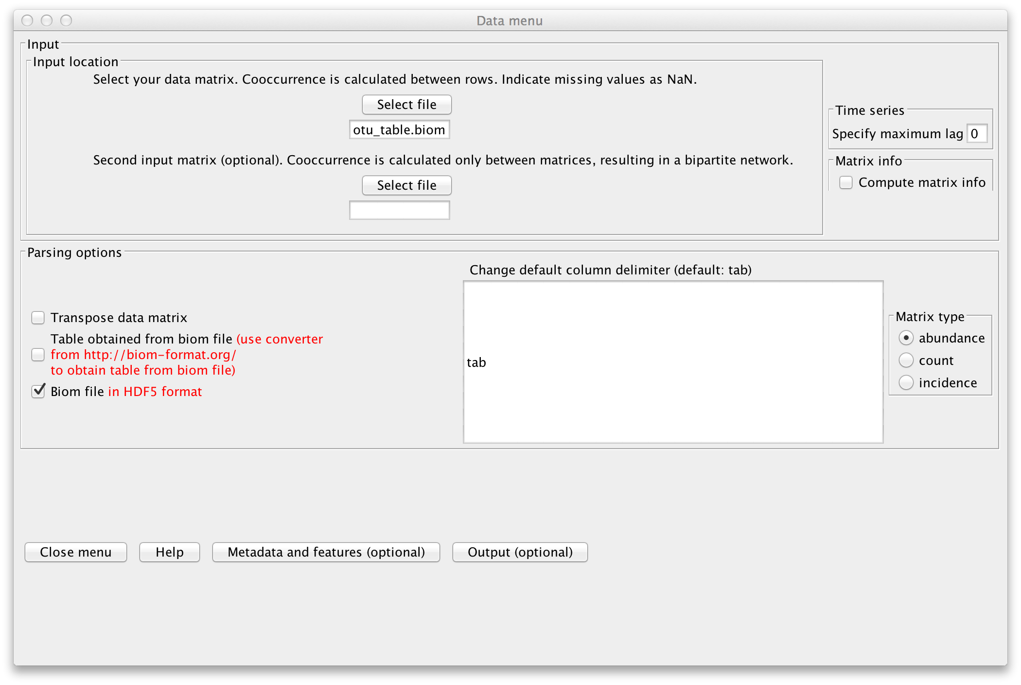 In the CoNet configuration, you have then to enable "Table obtained from biom file" instead