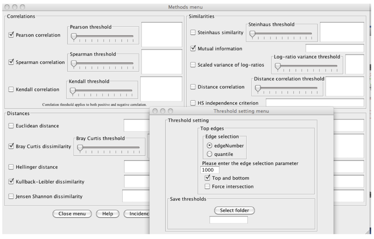 Spearman, Mutual Information, Bray Curtis and Kullback-Leibler dissimilarity. Instead of specifying