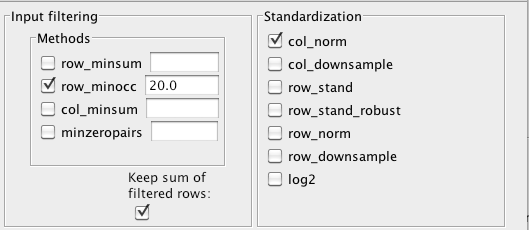 "Preprocessing and filtering menu" from the main menu and enabling "row_minocc" with value 20,