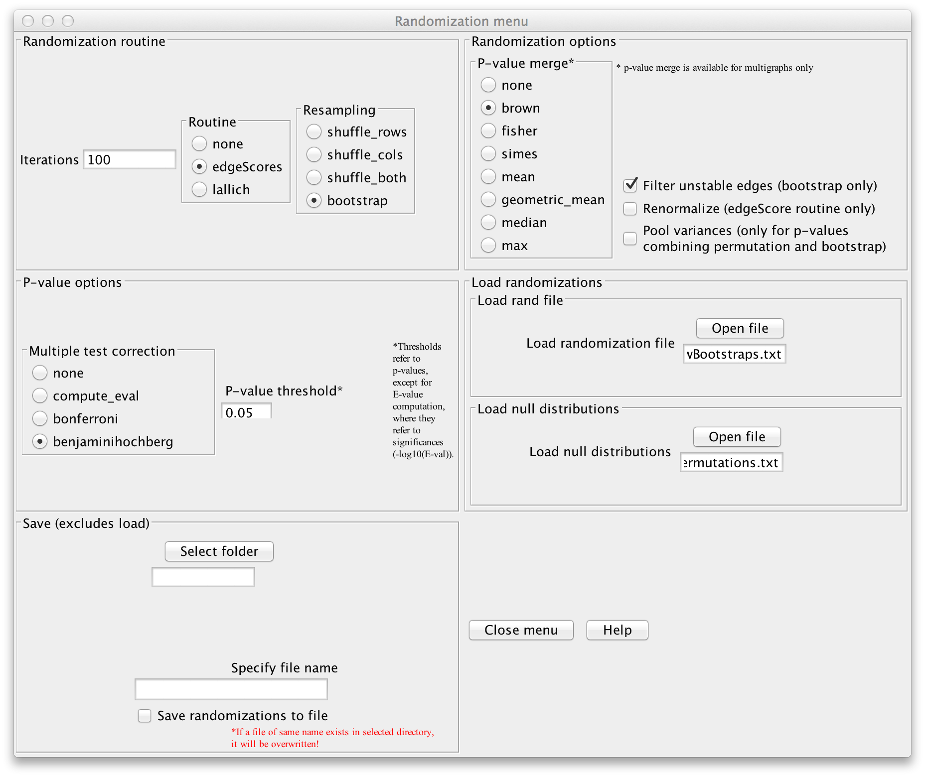 Randomization menu, select "edgeScores" as routine, "bootstrap" as resampling strategy,